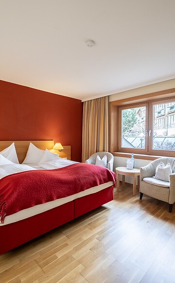 Im Stammhaus: Ca. 22 m², ausgestattet mit Doppelbett oder französisches Bett, Badezimmer mit Dusche/WC, Haarfön, Kosmetikspiegel, Badetasche mit Bade- und Saunatücher, für die Zeit Ihres Aufenthalts, Bademantel an der Rezeption erhältlich. Sat-TV, Telefon, WLAN, kleiner Schreibtisch, Zimmersafe, bequemer Stuhl (ohne Balkon).